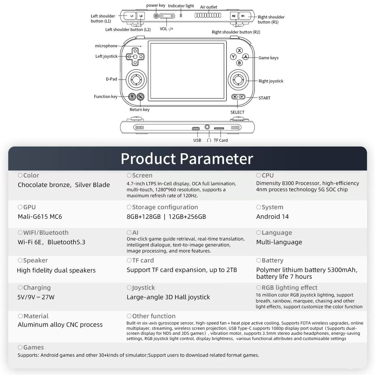 Built-in six-axis gyroscope sensor, high-speed fan + heat pipe active cooling. Supports FOTA wireless upgrades, online multiplayer, streaming, wireless screen projection, USB Type-C supports 1080p display port output(Supports dual-screen display for NDS and 3DS games), vibration motor, supports 3.5mm stereo audio headphones, energy-saving settings, RGB joystick light control, display brightness, various functional attributes and customizable settings.