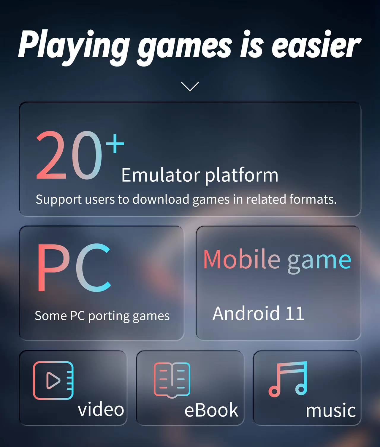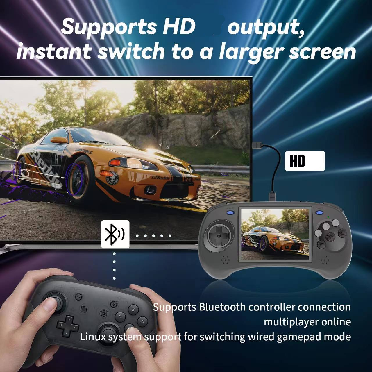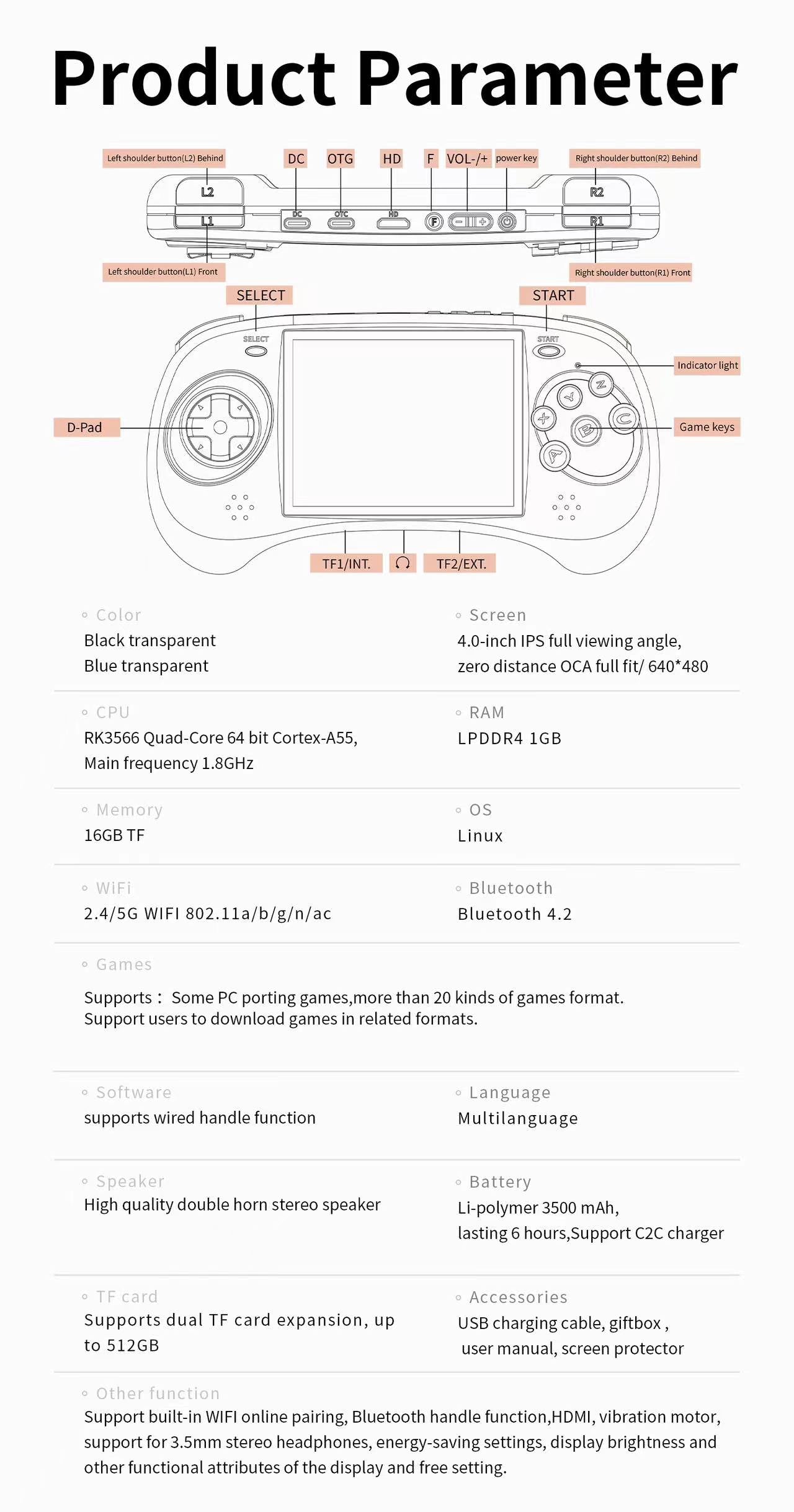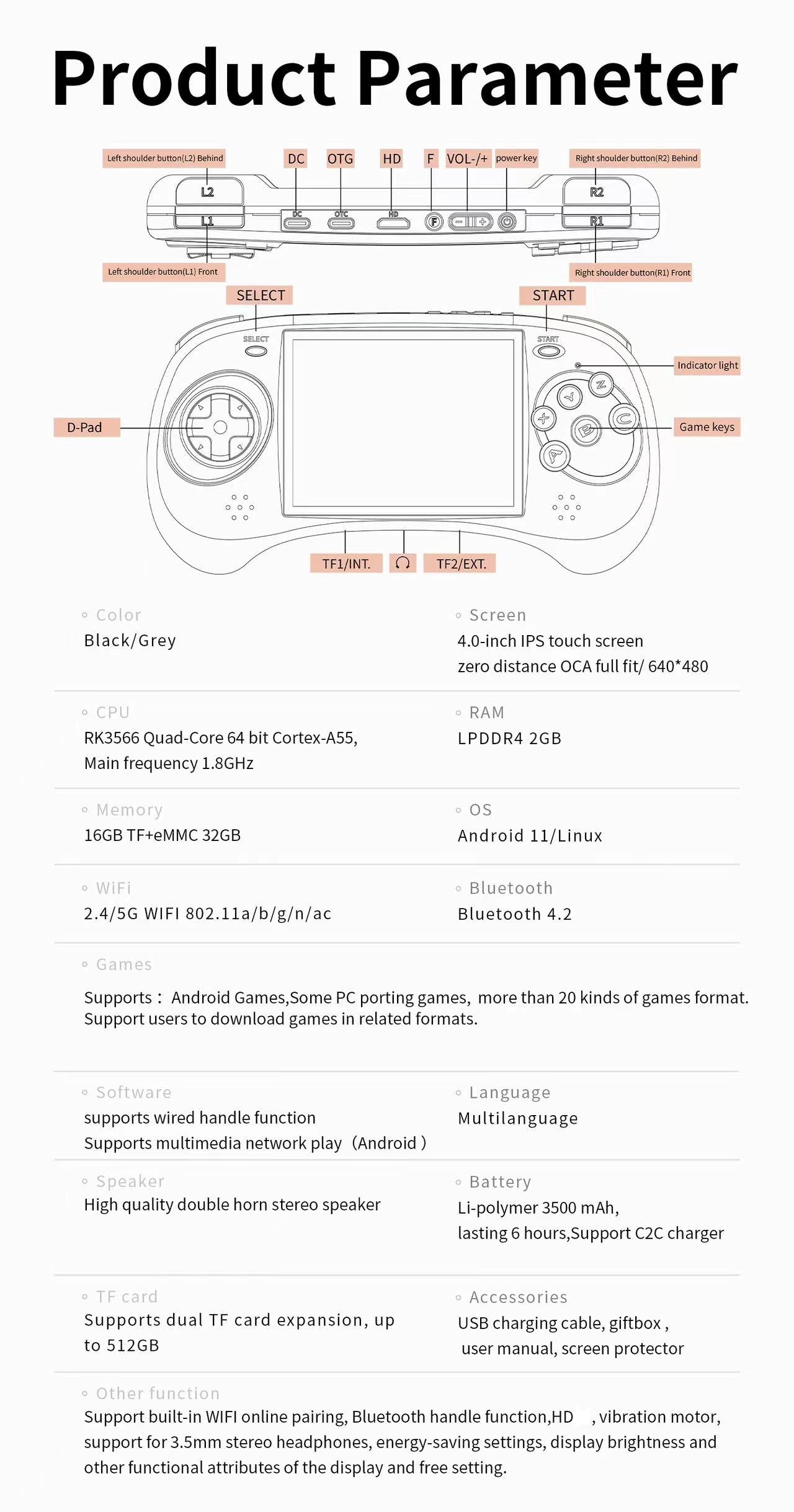 Support built-in WIFI online pairing, Bluetooth handle function,HD, vibration motor, support for 3.5mm stereo headphones, energy-saving settings, display brightness and other functional attributes of the display and free setting.