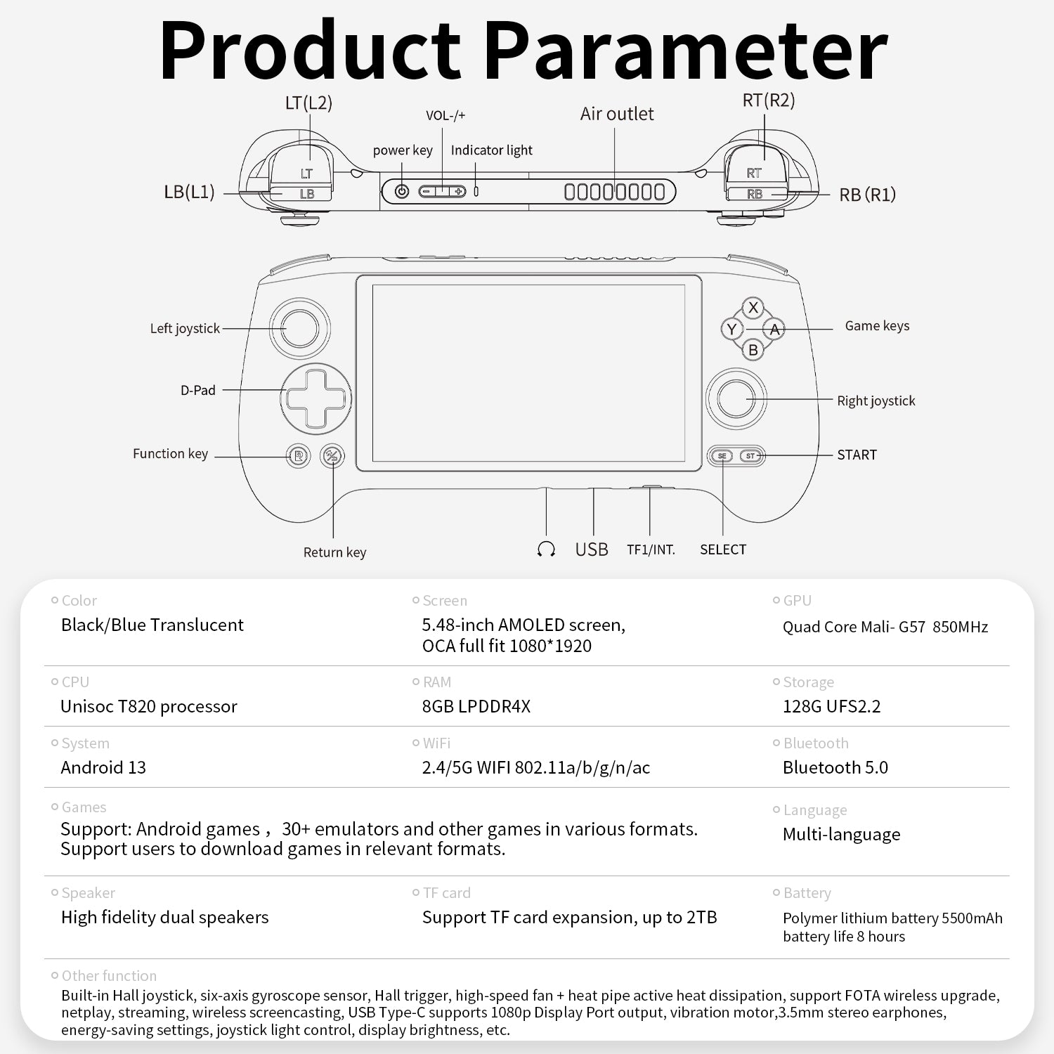 Built-in Hall joystick, six-axis gyroscope sensor, Hall trigger, high-speed fan + heat pipe active heat dissipation, support FOTA wireless upgrade, netplay, streaming, wireless screencasting, USB Type-C supports 1080p Display Port output, vibration motor, 3.5mm stereo earphones, energy-saving settings, joystick light control, display brightness, etc.