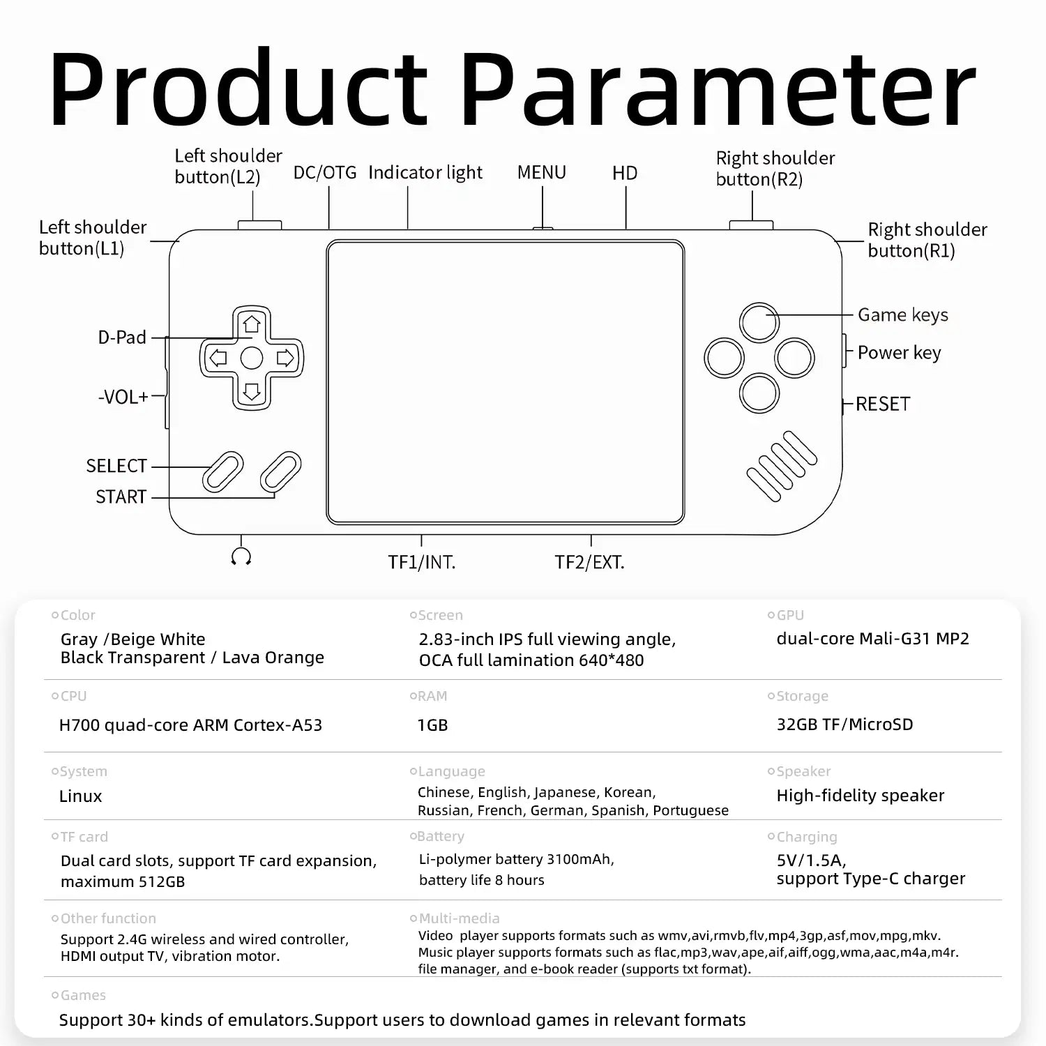 Video player supports formats such as "wmv", "avi","rmvb", "flv","mp4","3gp","asf","mov","mpg","mkv".Music player supports formats such as "flac", "mp3", "wav", "ape", "aif", "aiff", "ogg", "wma", "aac", "m4a", "m4r". file manager, and e-book reader (supports txt format)