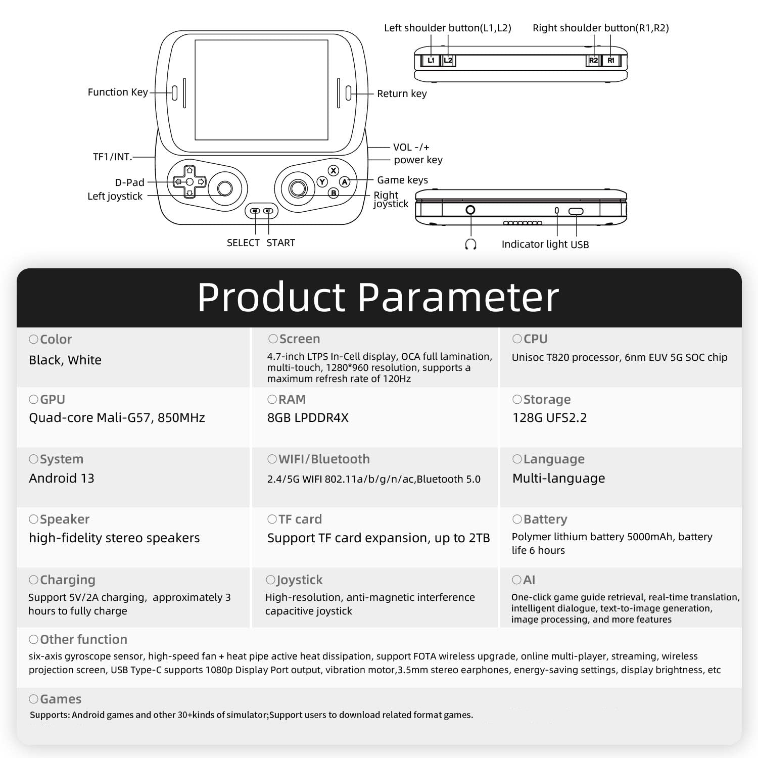 Six-axis gyroscope sensor, high-speed fan + heat pipe active heat dissipation, support FOTA wireless upgrade, online multi-player, streaming, wireless projection screen, USB Type-C supports 1080p Display Port output, vibration motor,3.5mm stereo earphones, energy-saving settings, display brightness, etc.